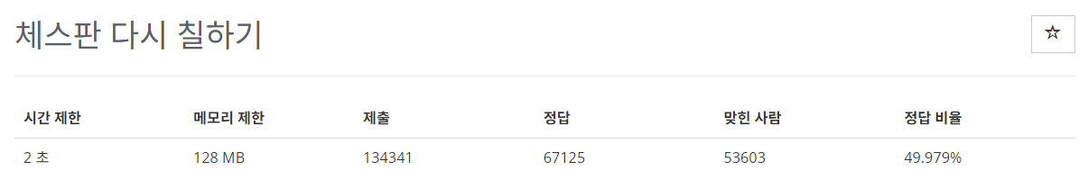 이 문제는 가능한 모든 경우를 전부 확인하는 브루트포스 방식으로 해결할 수 있었다. 단순히 8x8 체스판을 모두 확인하고, 두 가지 패턴 중 최소로 다시 칠해야 하는 횟수를 구하도록 직관적으로 구현했다.