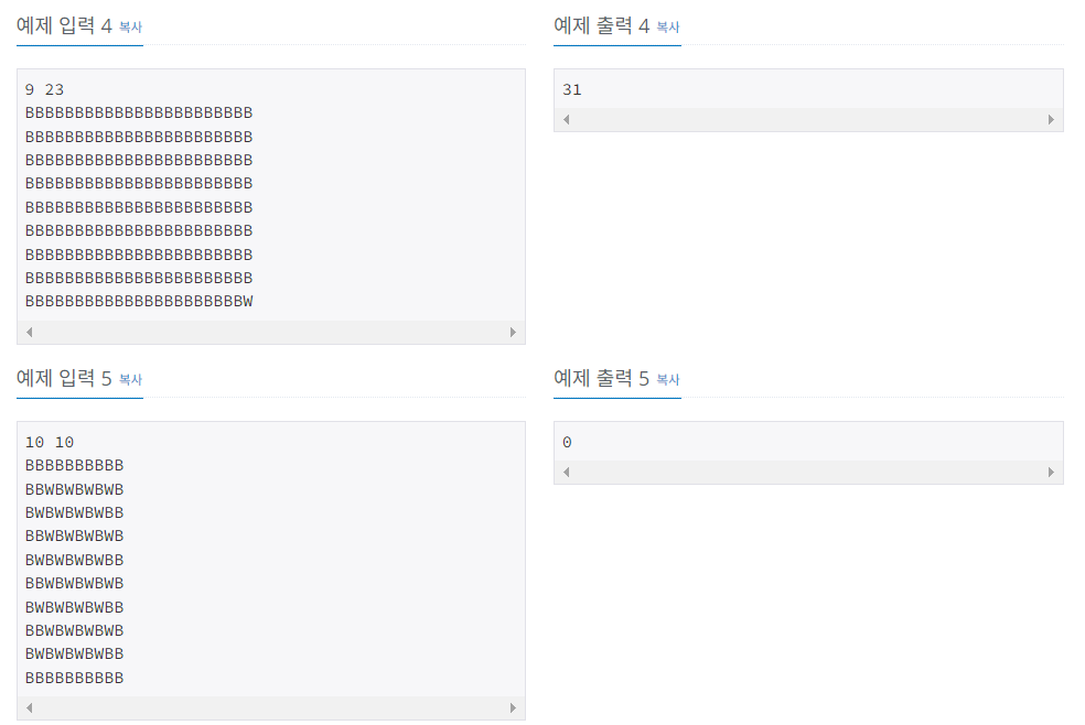 - cnt2는 첫 번째 칸이 'W'로 시작하는 체스판과 비교해 색칠해야 할 개수